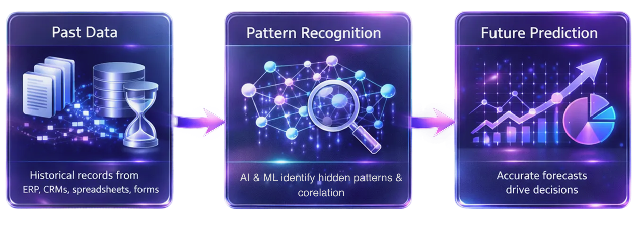 Predictive AI uses machine learning to analyze historical data and forecast future trends, helping businesses anticipate outcomes and make proactive decisions.